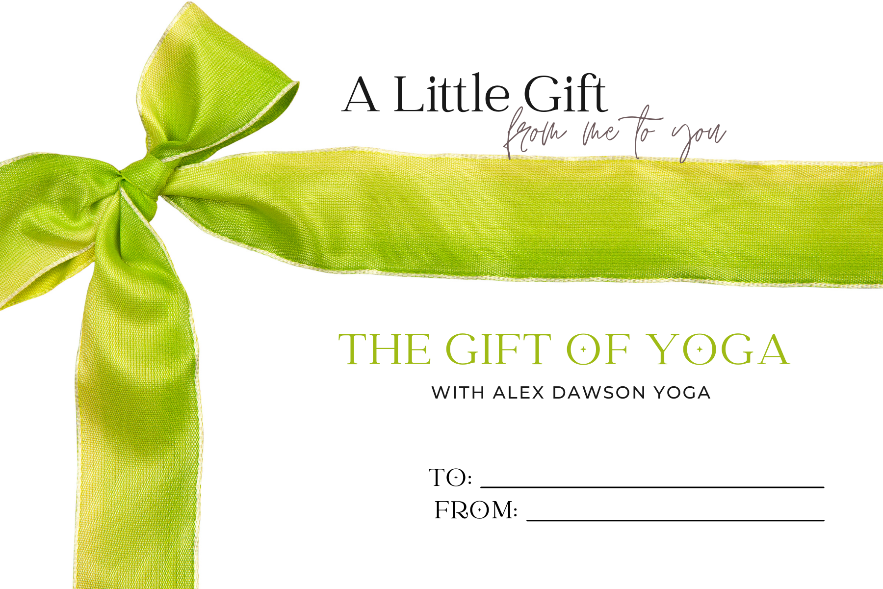 Once you submit your request, you will receive a personalized proof of your Gift Card, along with payment details within 24 hours. Thank you for sharing the gift of yoga! If you have any questions, please don’t hesitate to reach out to alexdawson1@mac.com.